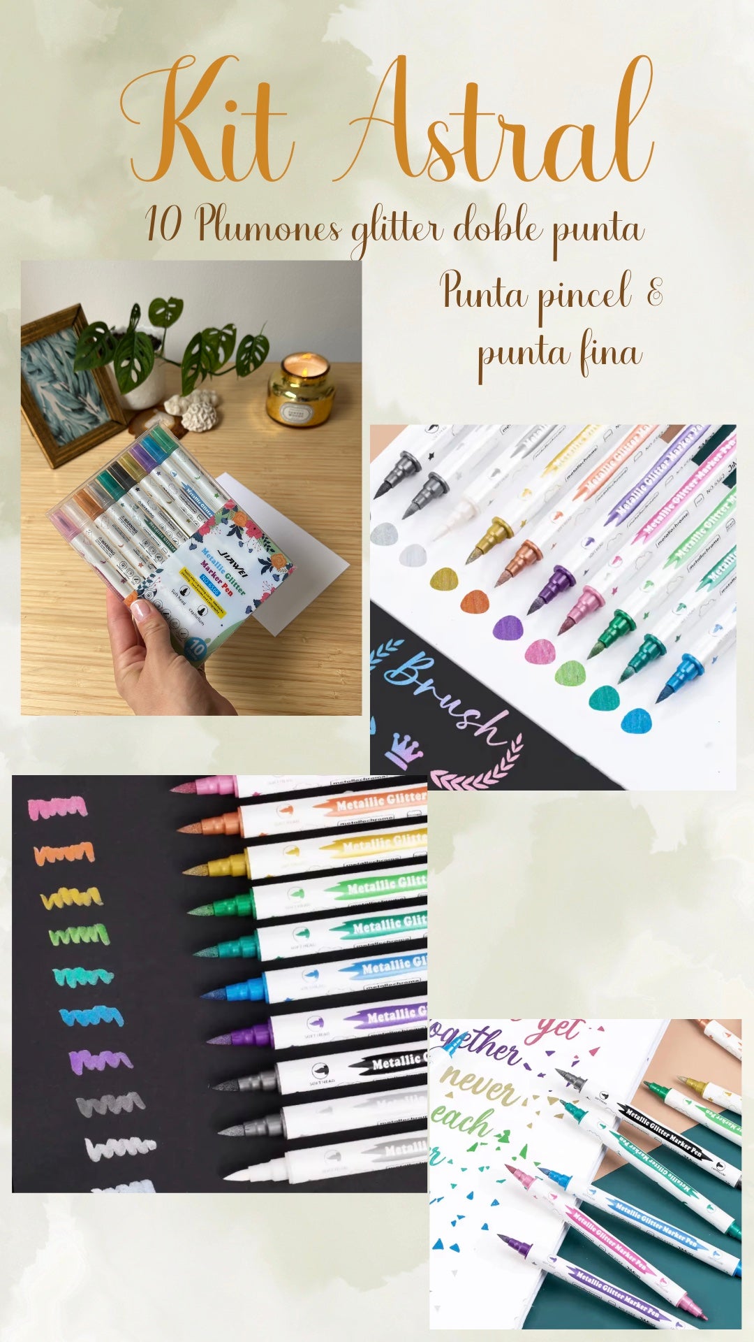 ✨10 Plumones Alta calidad Glitter - Doble punta - Pincel & fina