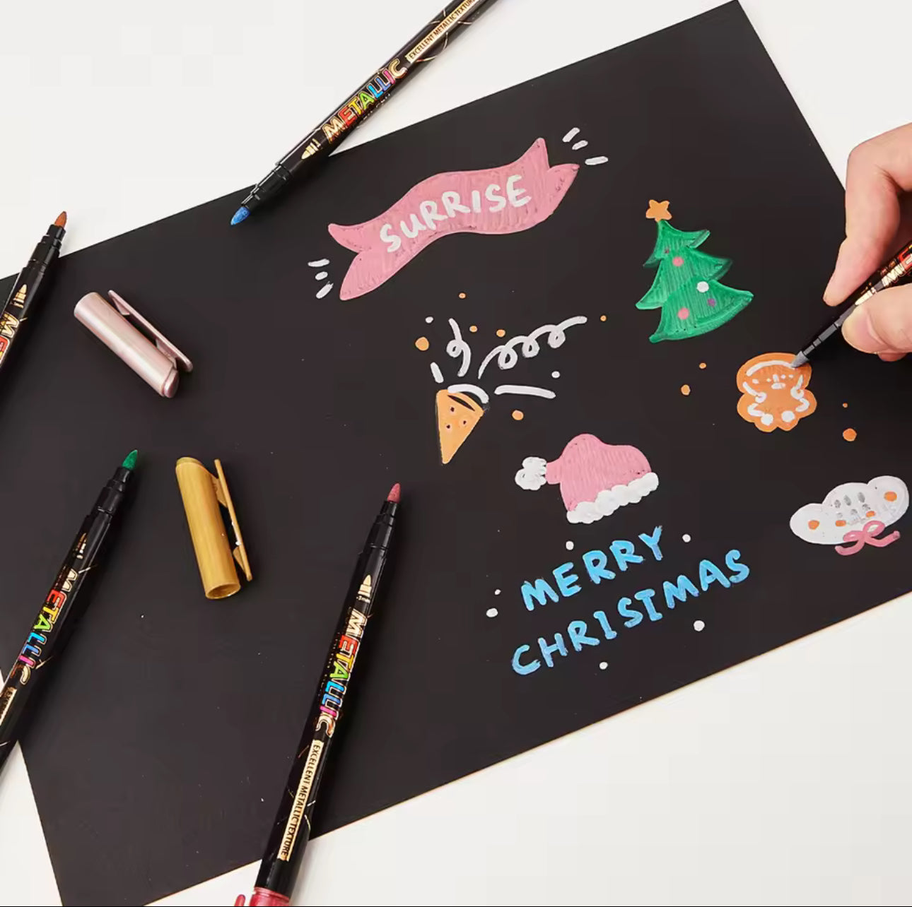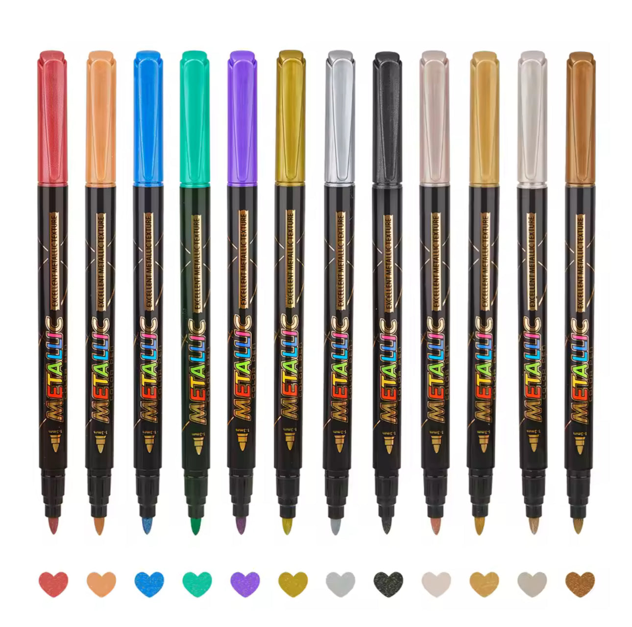 Descubre la creatividad sin límites con este set de 12 plumones metálicos. Cada plumón ofrece colores vibrantes con un acabado brillante que realza tus proyectos artísticos, manualidades y decoraciones. Perfectos para papel, cartulina y otras superficies, estos plumones te permiten agregar un toque elegante y profesional a tus diseños. Aprovecha su tinta de secado rápido para evitar borrones y lograr detalles precisos. Dale vida a tus ideas con un brillo metálico que captará todas las miradas. ¡Haz que cada trazo cuente!
