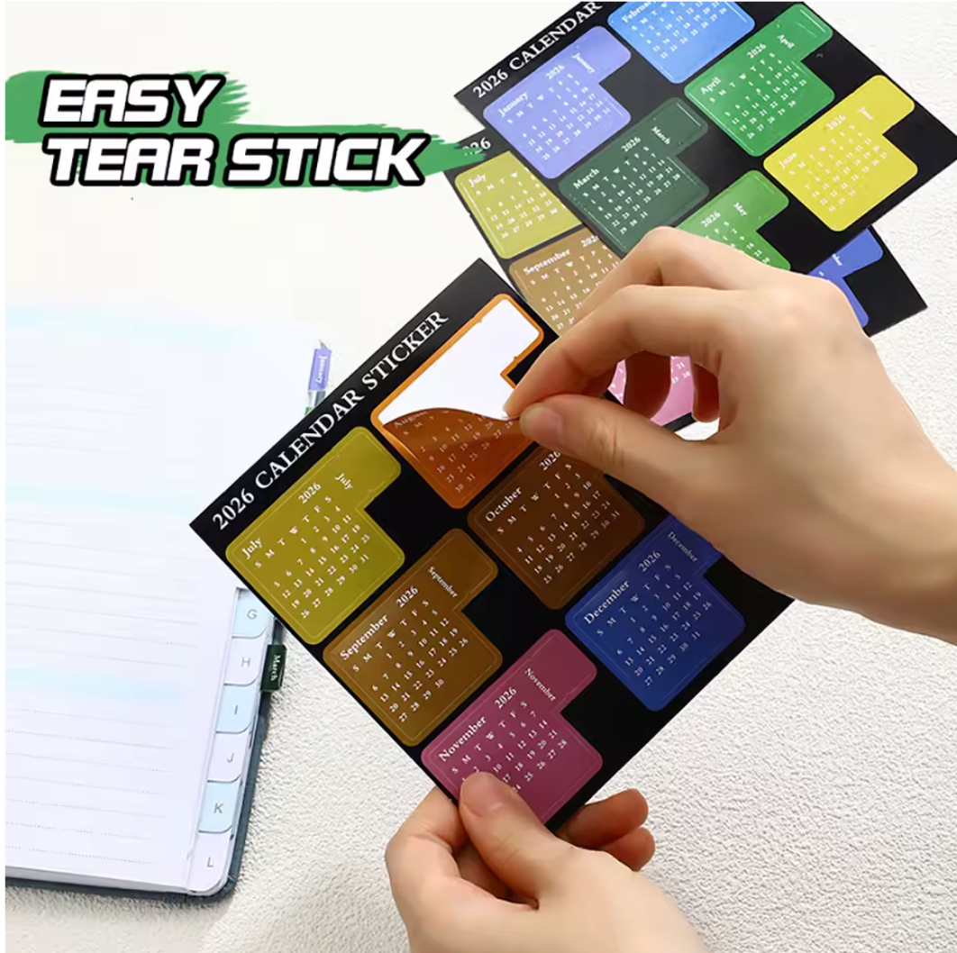 Organiza tu año con estilo. Este set de 2 hojas contiene 12 stickers índice calendario para 2026, uno por cada mes. Dóblalos en la esquina de tus páginas para marcar y localizar rápidamente tus secciones favoritas. Perfectos para agendas, cuadernos y planificadores. Mantén todo a la vista y nunca pierdas de vista tus metas mensuales. Un accesorio práctico y colorido que transforma tu escritorio en un espacio organizado y funcional.