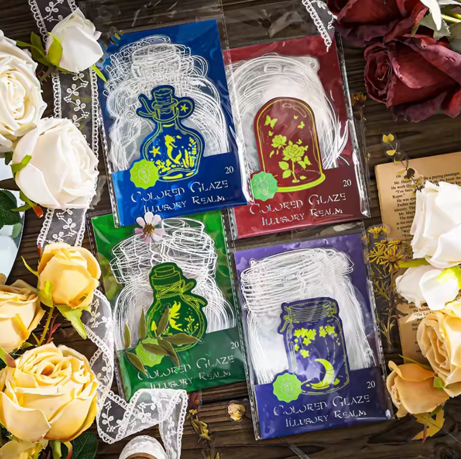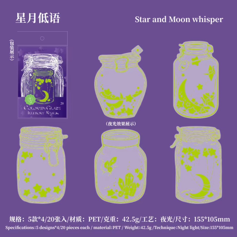 Descubre este set de 20 frascos transparentes y fosforescentes. Su diseño permite ver fácilmente el contenido, mientras que su efecto fosforescente aporta un toque mágico que brilla en la oscuridad.