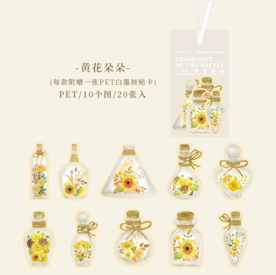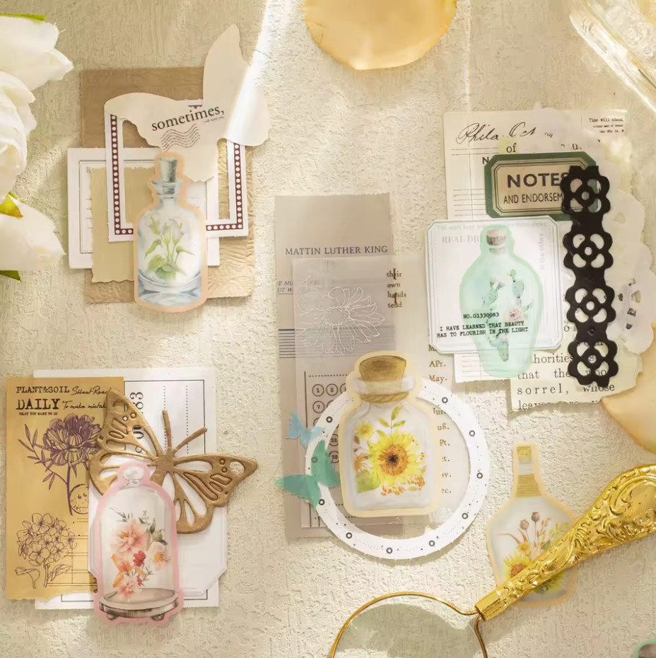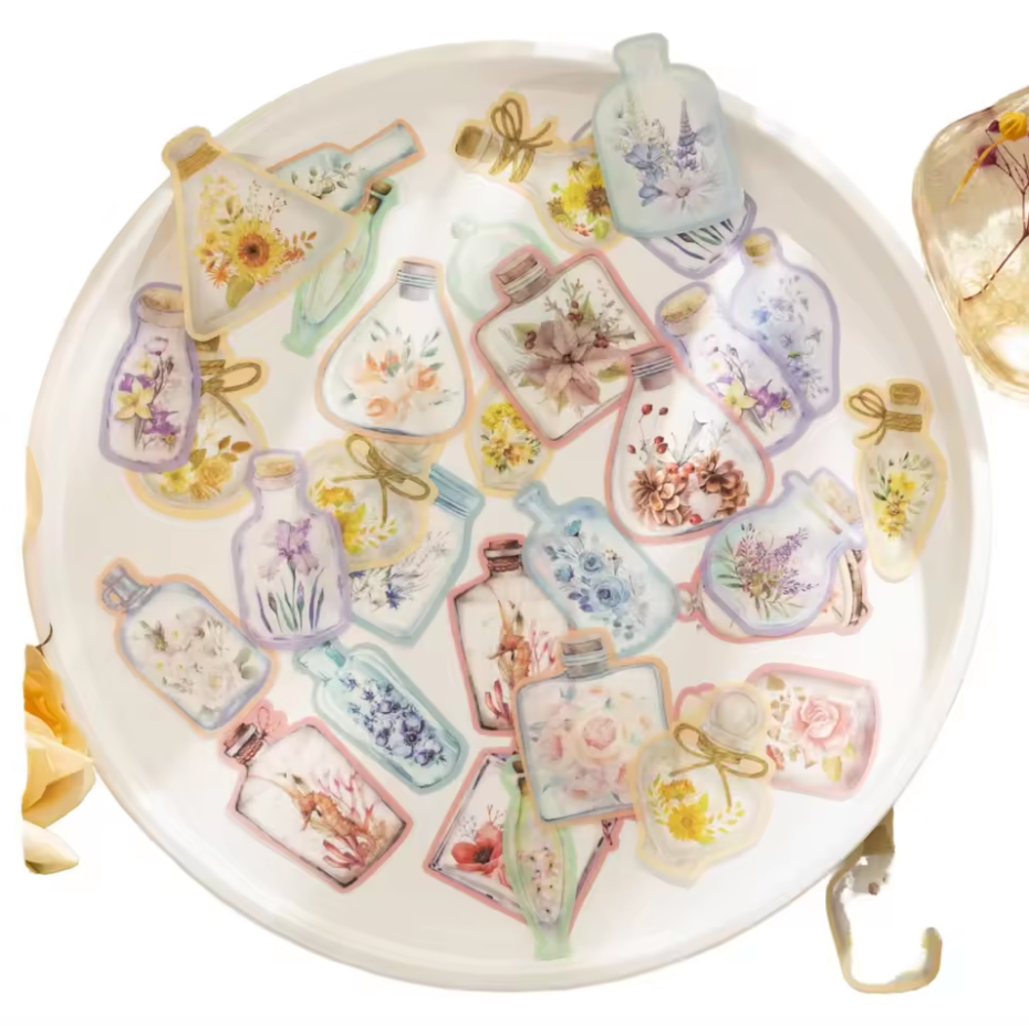 Estos 20 stickers transparentes de frascos y flores aportan un toque delicado y natural a tus proyectos creativos. Con 10 diseños diferentes, cada uno repetido dos veces, son perfectos para decorar agendas y cuadernos.