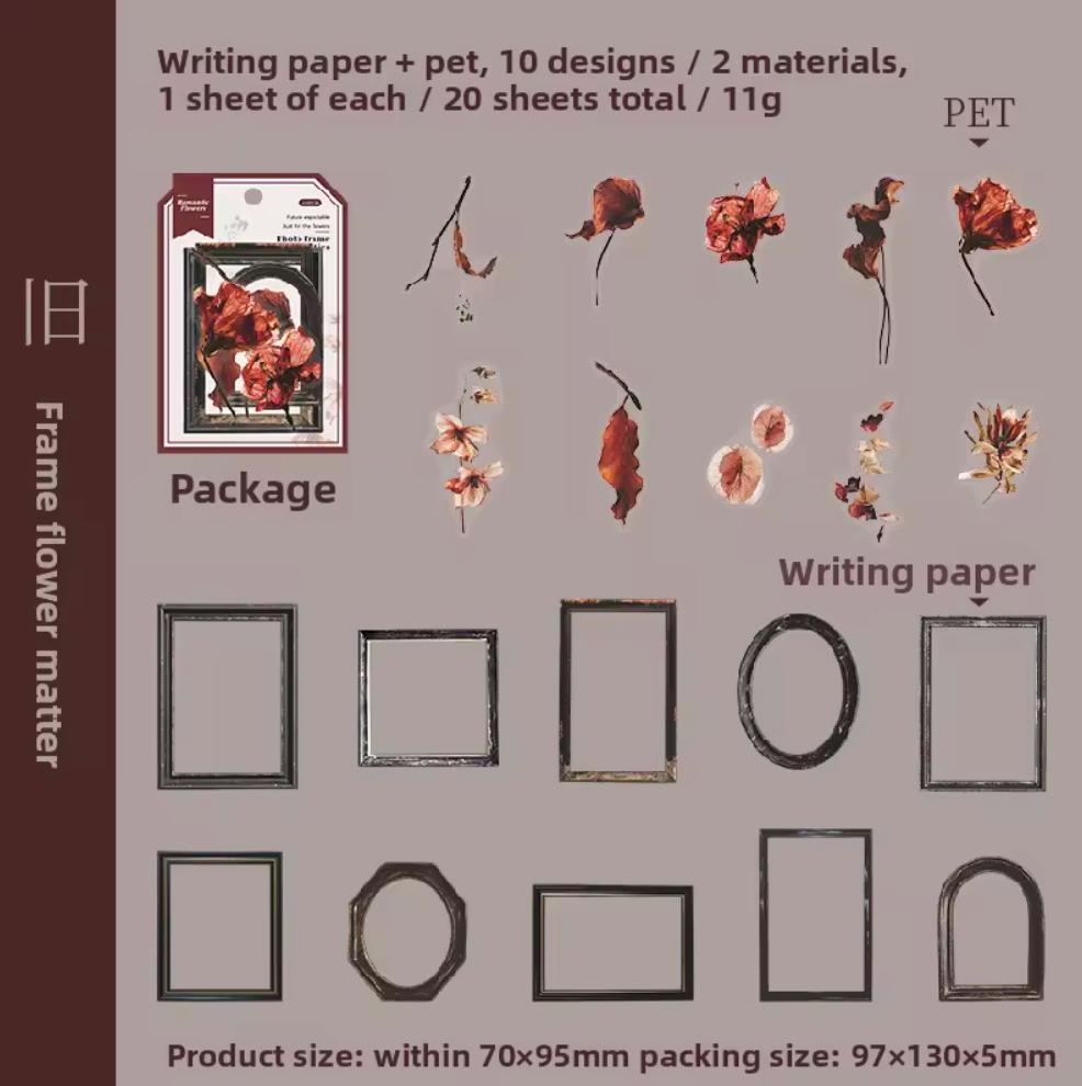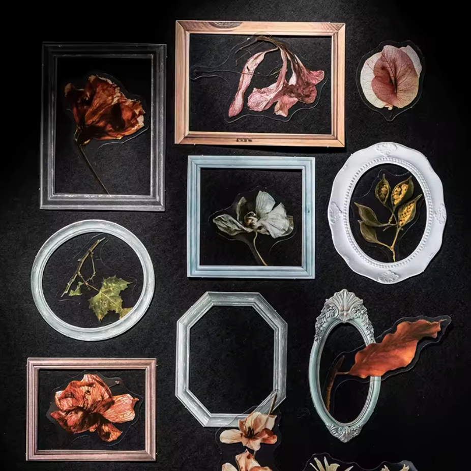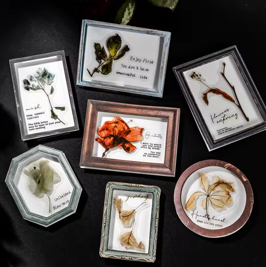 Embellece tus proyectos con este set de 20 stickers transparentes que combinan marcos elegantes y flores secas auténticas. Ideal para scrapbooking, decoración de regalos o simplemente para expresar tu estilo. Cada sticker captura la belleza natural de las flores prensadas en un formato versátil y duradero.