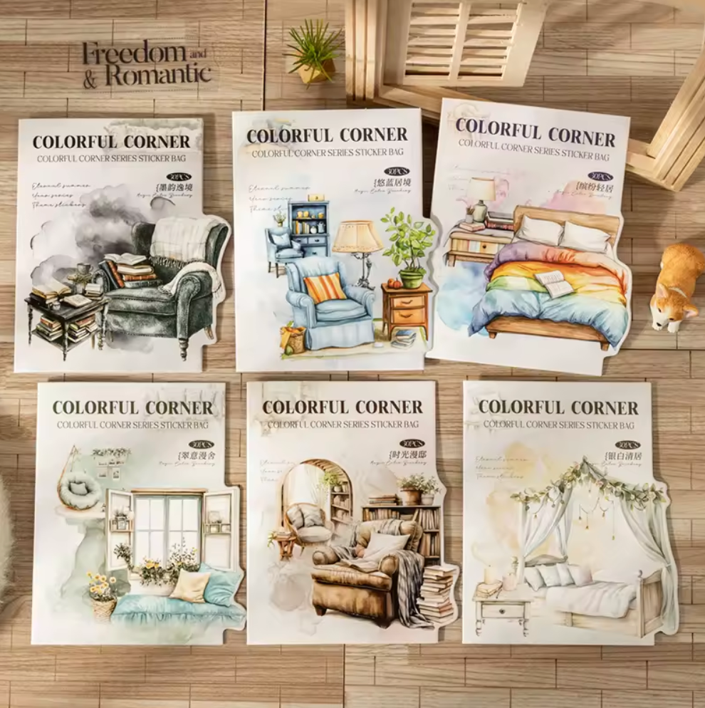 Transforma tus trabajos creativos con el set de 30 Stickers Colorful Corner. Estos adhesivos incluyen elegantes muebles interioristas, manchas de acuarela vibrantes y textos encantadores que darán vida y personalidad a tus proyectos.