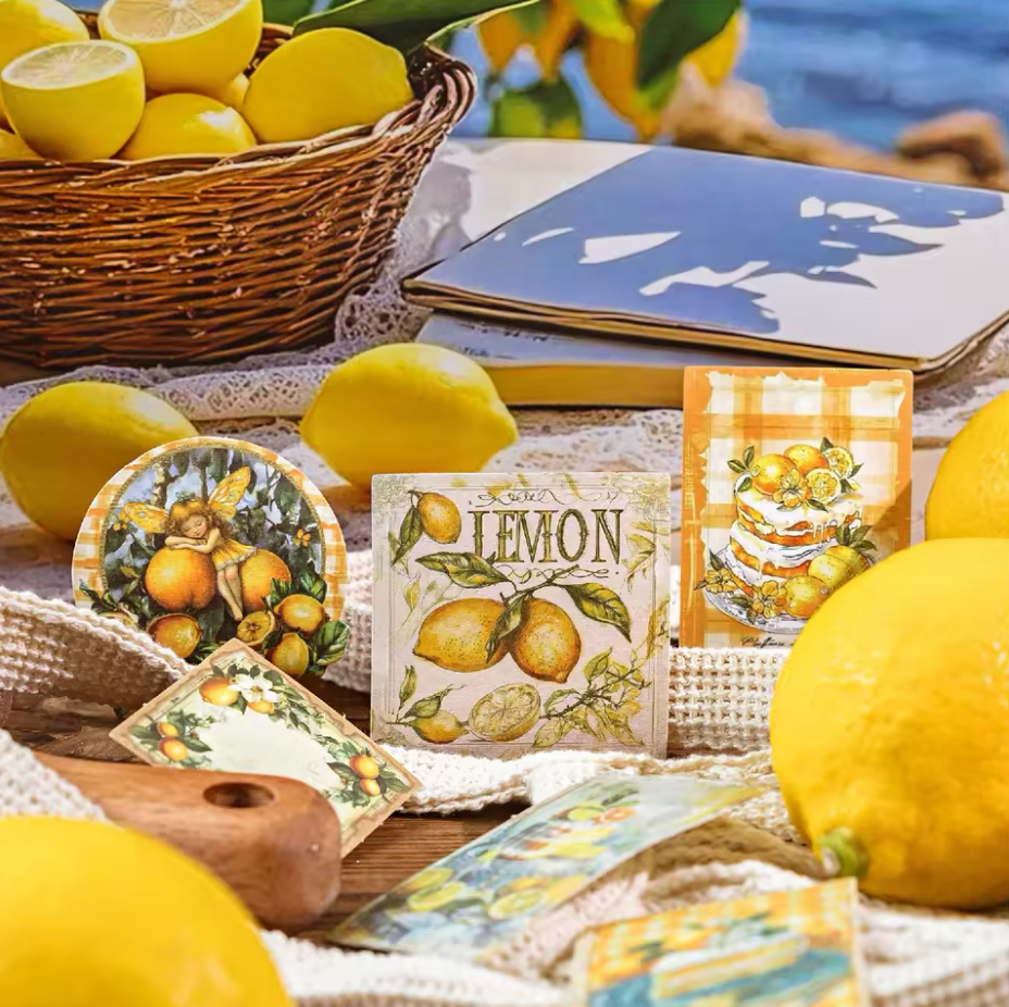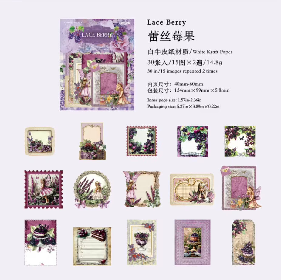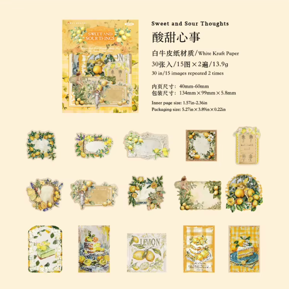Descubre la magia de los detalles con estos 30 stickers de timbres postales vintage, combinando frutas coloridas y delicadas hadas.