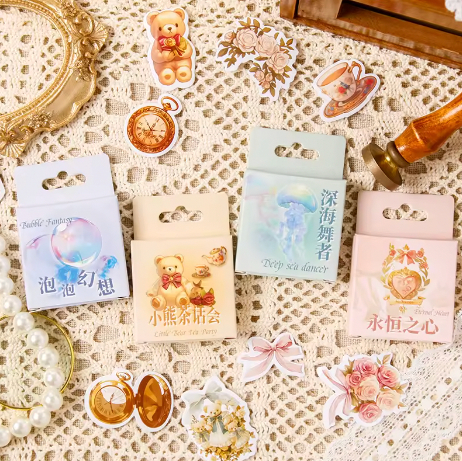 Descubre nuestro set de 4 cajitas de stickers con diseños irresistibles: Burbujas, Ositos, Medusas y Romántico. Cada caja trae una colección única de stickers de alta calidad, perfectos para personalizar tus proyectos ¡Completa tu colección hoy!