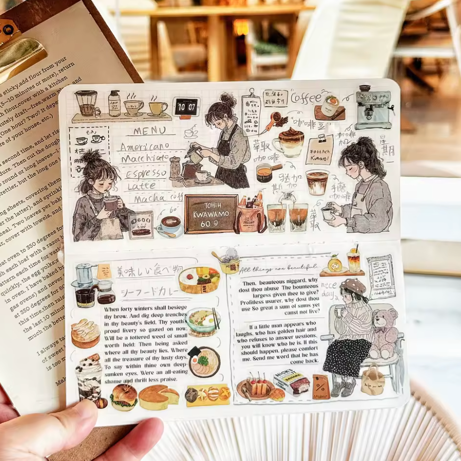 Descubre 4 hojas de stickers transparentes con diseños mini de comida que aportan un toque original y divertido a tus trabajos.