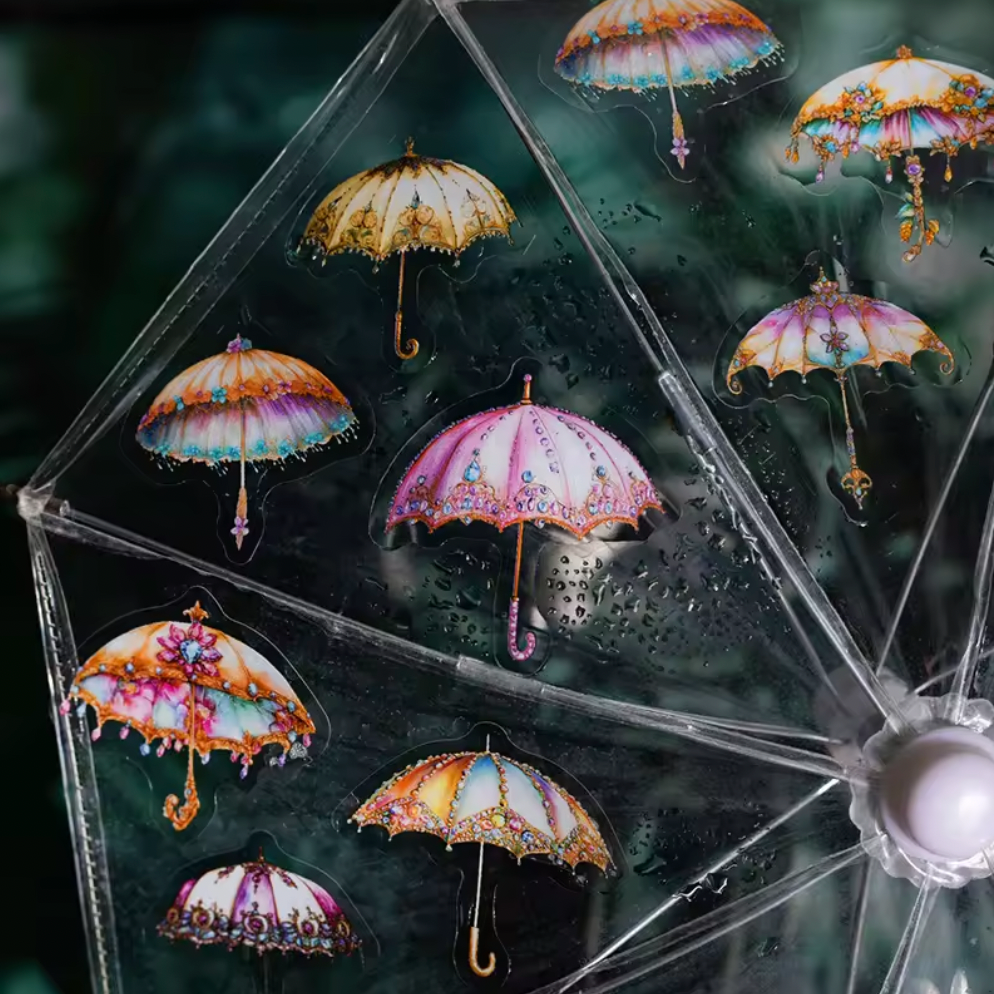 Añade un toque encantador a tus obras con este set de 50 stickers paraguas transparentes.