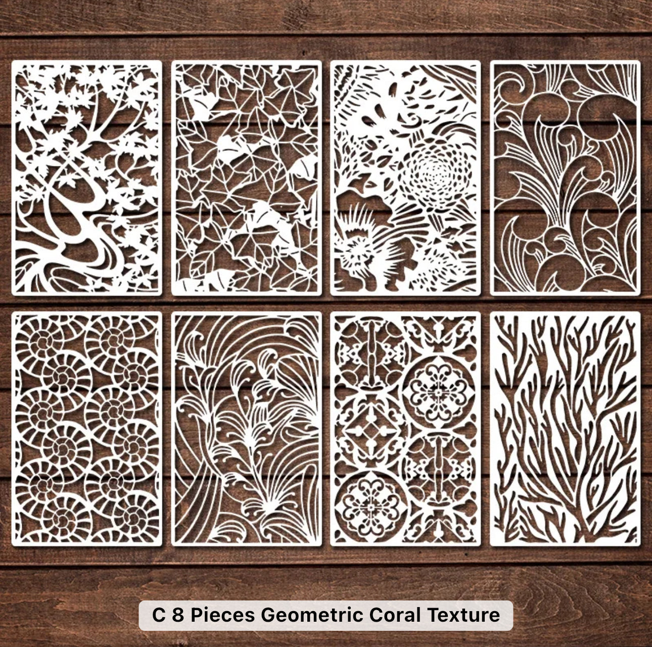 ¡Crea diseños increíbles con nuestros 8 Stencils Grandes! Ideal para tus proyectos de decoración o para darle un toque único a tus paredes. Incluye varios tamaños, desde 12cm x 25cm (Opcion A) hasta 18cm x 28cm (Todas las opciones menos la A) . ¡Haz realidad tus ideas creativas con facilidad y estilo con nuestros stencils!