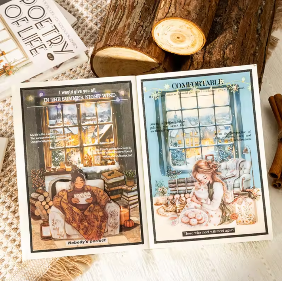 Descubre el encanto del "Libro de stickers 20 páginas Poetry of Life", una colección única de 10 páginas de delicado papel de arroz y 10 páginas de stickers transparentes.