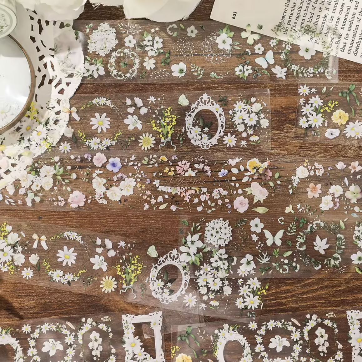 Transforma tus proyectos creativos con este elegante washi tape ancho de flores. Su diseño transparente permite que el color de fondo brille a través, creando efectos visuales únicos y sofisticados. Con 2 metros de largo, tienes suficiente material para decorar regalos, cuadernos, marcos y más. Perfecto para scrapbooking, manualidades y proyectos DIY. Agrega un toque de naturaleza y delicadeza a cada creación.